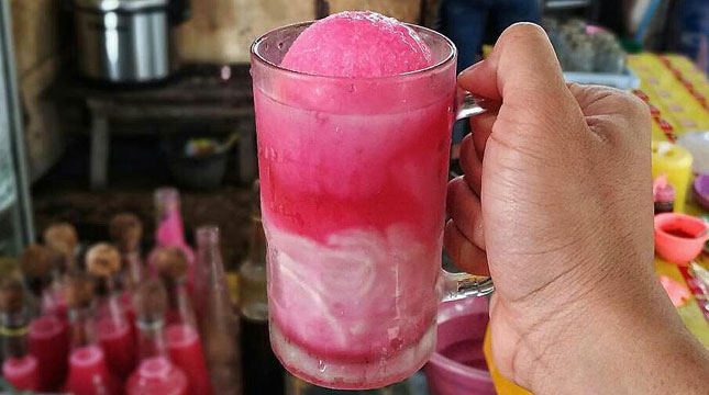 Es Sagwan disajikan dalam gelas yang diisi campuran santan, es serut serta sirup manis berwarna merah