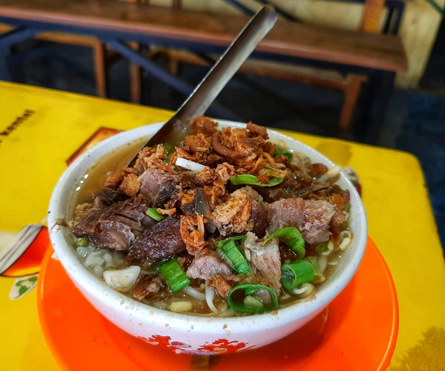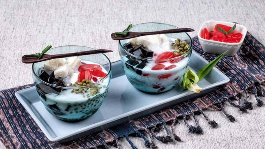 Es Lontrong terbuat dari campuran santan dan air gula yang diberi isian kacang hijau serta cincau.